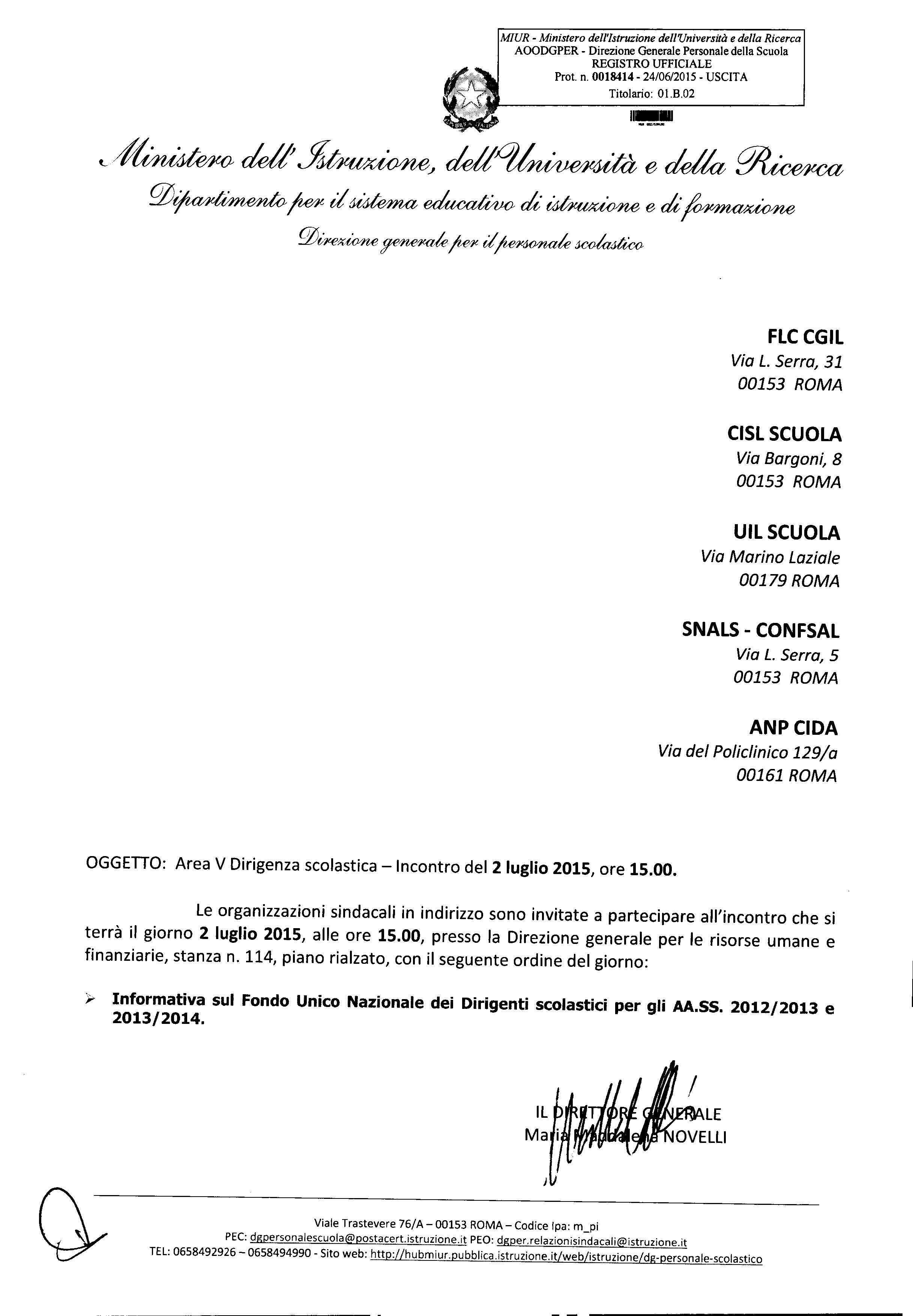 Il Direttore generale del personale scolastico del Miur ha invitato le organizzazioni sindacali rappresentative dell’Area V il 2 luglio 2015 per una i