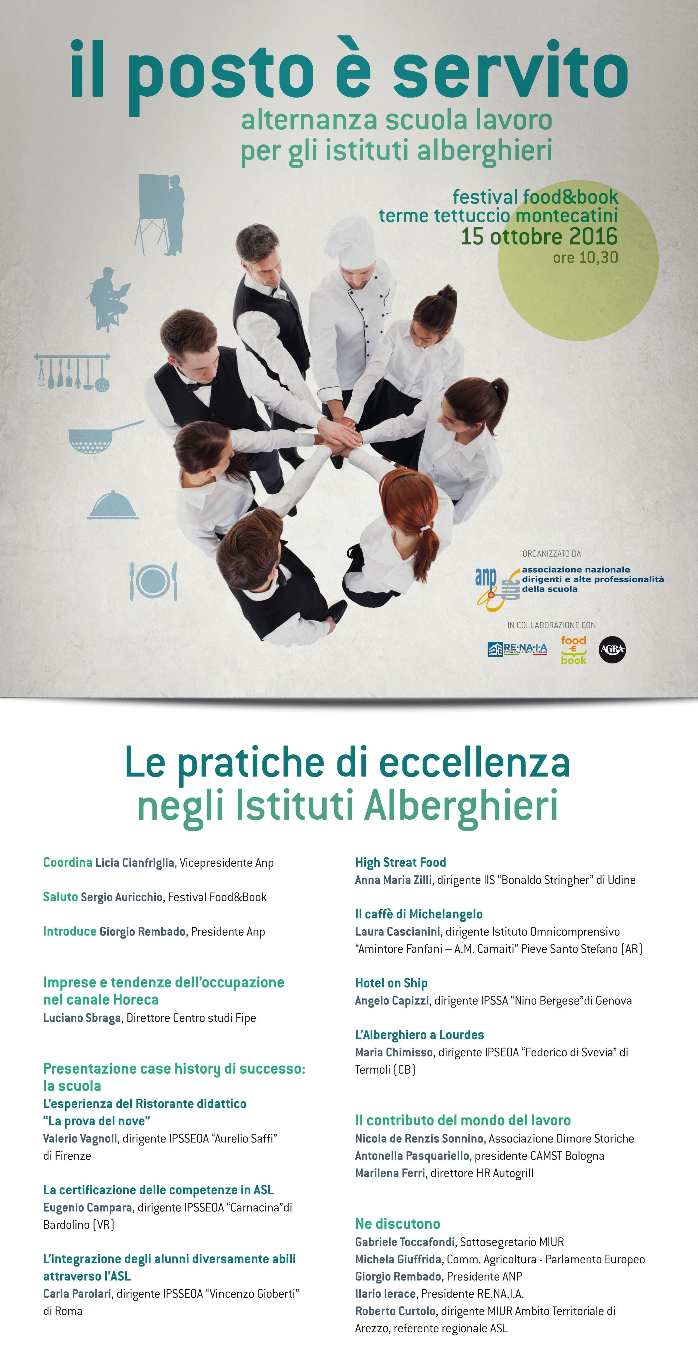 L’ANP organizza, all’interno del Festival Food&Book in programma a Montecatini Terme (PT) dal 14 al 16 ottobre, una nuova edizione del Convegno sulle iniziative di alternanza scuola-lavoro per presentare le esperienze di eccellenza negli Istituti alberghieri.
