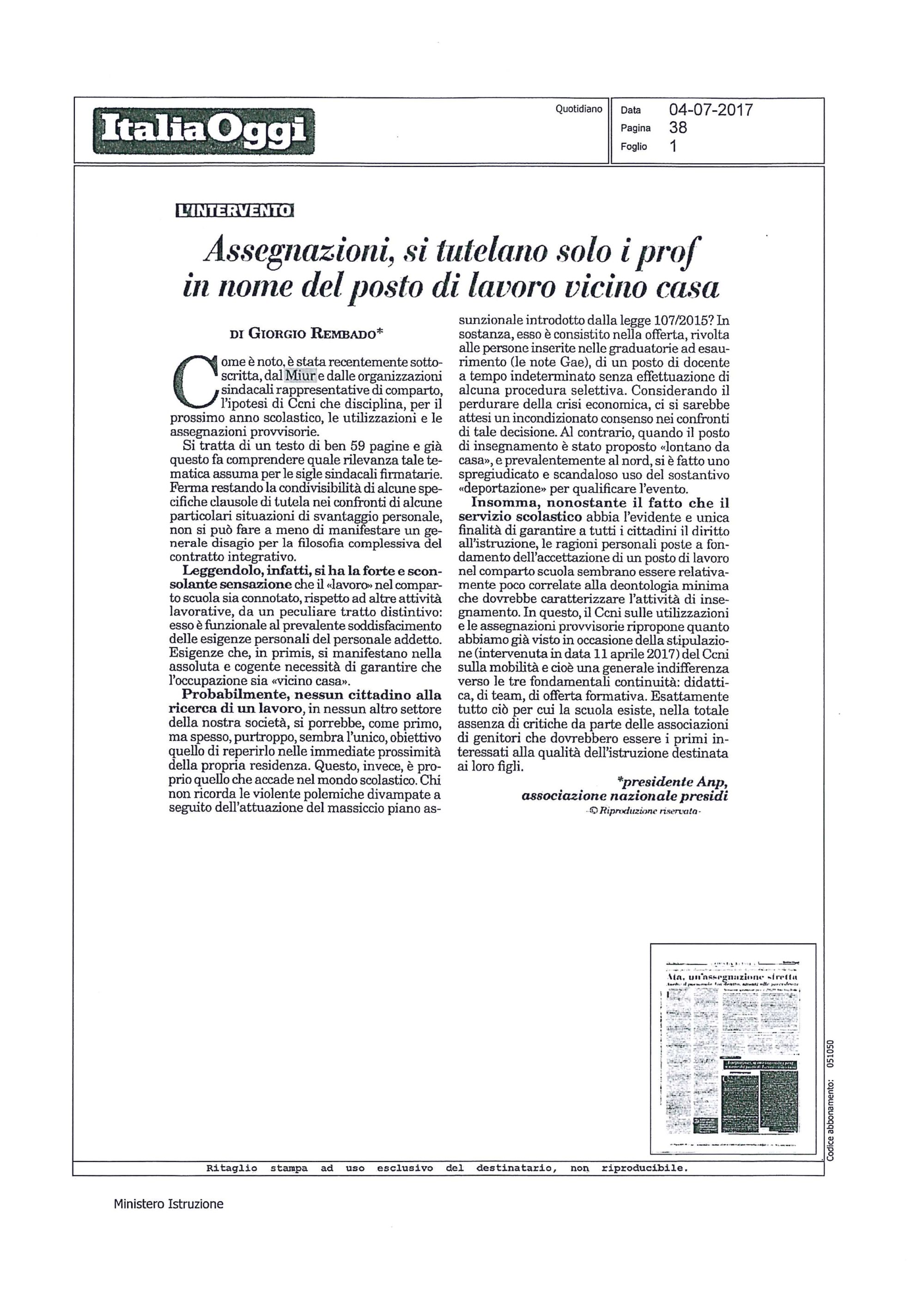 Rembado: 'Assegnazioni, si tutelano solo i prof in nome del posto di lavoro vicino casa' – Italiaoggi, 4/7/2017