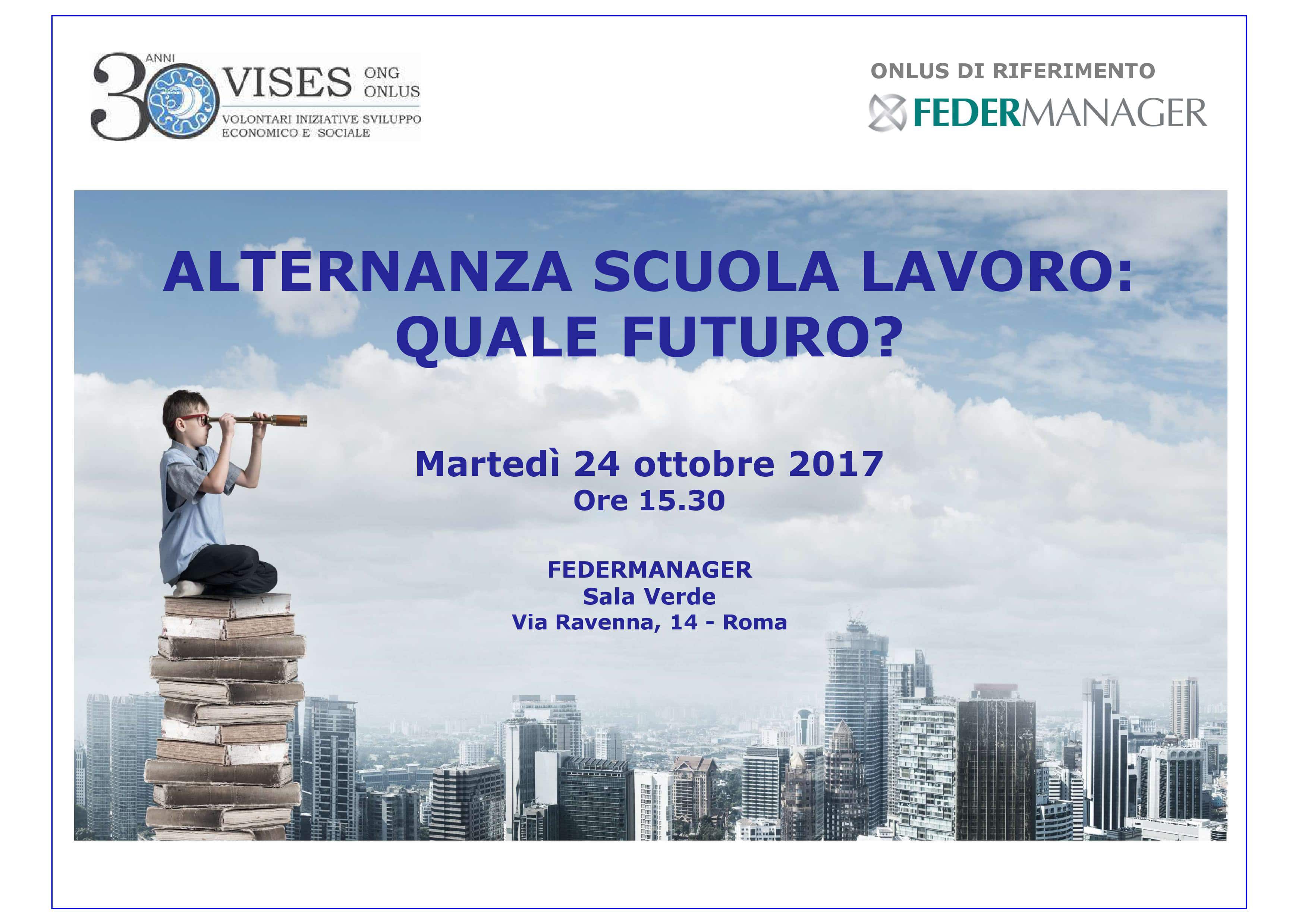 In concomitanza con la ricorrenza dei 30 anni dell’Associazione, VISES, onlus di riferimento Federmanager, organizza il convegno sul tema: ALTERNANZA SCUOLA LAVORO: QUALE FUTURO? che si svolgerà martedì 24 ottobre p.v. dalle ore 15.30 presso la sede Federmanager in via Ravenna, 14 a Roma.