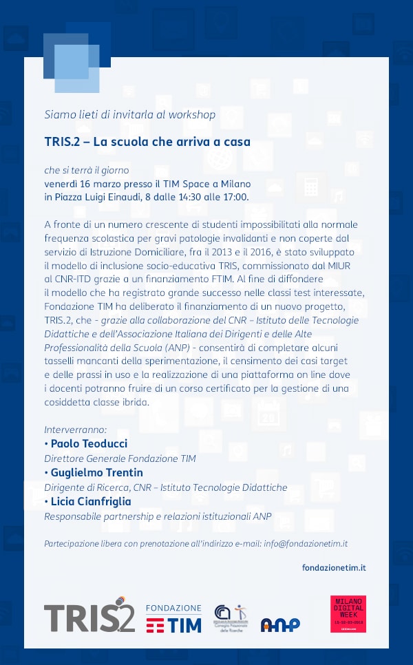 Invito al workshop per dirigenti e docenti: Milano, 16 marzo “TRIS.2 – La scuola che arriva a casa”