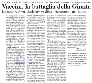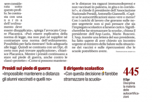 (AGI) – Roma, 6 ago. – -La paventata eventualita’ di un|differimento degli obblighi vaccinali pone enormi problemi|organizzativi al sistema educativo-. E’ quanto scrive il|presidente dell’Associazione nazionale presidi, Antonello|Giannelli, nella lettera inviata al ministro della Salute,|Giulia Grillo, con la quale si richiede un incontro urgente,|sottolineando che -l’ANP, forte dell’adesione di oltre il 50%|dei dirigenti scolastici in servizio nonche’ di numerosi|docenti costituisce da sempre un punto di riferimento sindacale|e professionale per la categoria e per la scuola-. -Non e’|realisticamente ipotizzabile – si legge nella lettera -|l’eliminazione del rischio di contagio per i bambini|impossibilitati a vaccinarsi mediante un inserimento in classi|’differenziate’. I media hanno inoltre veicolato il messaggio,|totalmente infondato, che fa sembrare le|autocertificazioni come soluzioni semplici e prive di|conseguenze anche penali. Le chiedo pertanto – conclude|Giannelli – un incontro urgente per affrontare in dettaglio la|questione-. (AGI)|Noc|062102 AGO 18||NNNN|