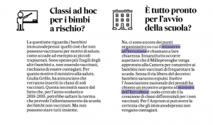 Giannelli, urgente affrontare la questione| Roma, 7 ago. (Adnkronos/Labitalia) – -Un incontro urgente per |affrontare in dettaglio la questione- dei vaccini e scuola. E” quanto |chiede il presidente dell”Associazione nazionale presidi, Antonello |Giannelli, alla ministra della Salute, Giulia Grillo.| -La paventata eventualità di un differimento degli obblighi vaccinali |-scrive l”Anp- pone enormi problemi organizzativi al sistema |educativo. Non è realisticamente ipotizzabile, in particolare, |l”eliminazione del rischio di contagio per i bambini impossibilitati a|vaccinarsi mediante un inserimento in classi ”differenziate”-.| -I media hanno inoltre veicolato il messaggio, totalmente infondato, |che fa sembrare le autocertificazioni come soluzioni semplici e prive |di conseguenze anche penali-, conclude la richiesta dell”Anp.| (Map/Adnkronos)|ISSN 2465 – 1222|07-AGO-18 12:40|NNNN|