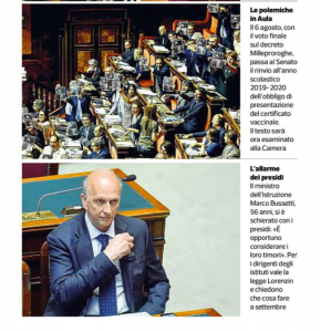 | Roma, 13 ago. (AdnKronos Salute) – -C”è un disegno di legge che sarà |approvato nei tempi parlamentari, quindi il nuovo anno scolastico |inizierà in regime di decreto Lorenzin. La mamma che si vanta di aver |falsificato l”autocertificazione sappia che rischia fino a due anni di|galera. La legge va applicata, perché non si gioca con la salute-. |Così Luigi Di Maio, vicepremier e ministro dello Sviluppo economico, |in un”intervista al ”Corriere della Sera”.| E ancora, sulle divisioni all”interno del Movimento: -Voglio mettere a|tacere qualche idea malsana contro i vaccini – aggiunge Di Maio – Da |quando sono capo politico del Movimento non siamo mai stati contro, |noi vogliamo che si facciano. Poi quel che noi non vediamo di buon |occhio è legare l”obbligo alla frequenza scolastica, invece che |introdurlo quando c”è il rischio di epidemie-.| (Frm/AdnKronos)|ISSN 2465 – 1222|13-AGO-18 12:38|NNNN|