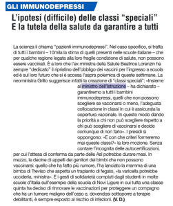 |PPA0054 1 POL NG01 824 ITA0054;|VACCINI, ANP: BAMBINI IMMUNODEPRESSI IN CLASSI PARTICOLARI? È||||RIPUGNANTE|(Public Policy) – Roma, 04 set – -Riguardo all”ipotesi di|assegnare i bambini a rischio, immunodepressi, a classi|particolari, questo non è possibile per diverse ragioni. E”|una forma di segregazione dei più deboli, che è qualcosa che|ripugna il nostro ordinamento. Ma poi, al di là dell”aspetto|deontologico, non si può fare a livello pratico: la scuola|non è un ospedale-. |Lo ha detto Antonello Giannelli, presidente dell”Associazione|nazionale dirigenti pubblici e alte professionalità della|scuola (Anp), nel corso di un”audizione alla Camera davanti|alle commissioni Affari costituzionali e Bilancio sul dl|Milleproroghe.|(Public Policy) @PPolicy_News |PAM |041413 set 2018||