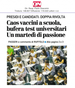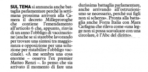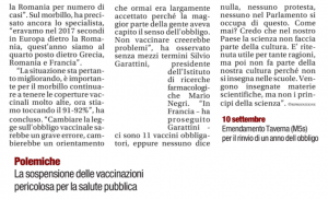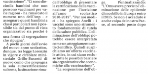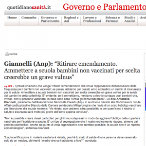| (ANSA) – ROMA, 4 SET – Durante l’audizione, nell’ambito|dell’esame del disegno di legge C. 1117, cosiddetto -mille|proroghe-, il Presidente dell’ANP, Antonello Giannelli, ha|chiesto in maniera netta l’eliminazione del comma 3-octies|dell’articolo 6, che prevede il rinvio di un anno dell’obbligo|di presentazione della documentazione attestante le vaccinazioni|previste come requisito di accesso ai servizi educativi per|l’infanzia. | Riguardo agli obblighi vaccinali, il presidente Giannelli,|nel ribadire che la salute pubblica e l’interesse generale|vengono prima del diritto all’istruzione, ha sottolineato che la|modifica della normativa vigente metterebbe a rischio la salute|dei bambini che non possono sottoporsi a vaccinazione. |Sottolineando la necessita’ di dare alle scuole riferimenti|normativi certi e non contraddittori, Giannelli ha ripetuto|quanto gia’ dichiarato dall’ANP in ogni sede ed occasione circa|l’inefficacia della circolare relativa all’autocertificazione ed|ha chiesto in maniera netta l’eliminazione dal decreto in esame|del comma 3-octies dell’articolo 6, introdotto nel corso|dell’esame in Senato. Lasciando quindi validi gli obblighi|vaccinali. ||(ANSA).|| VR|04-SET-18 17:27 NNN|