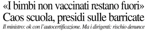 |(DIRE) Roma, 4 set. – -Sui vaccini la nostra posizione e’ chiara:|il decreto Lorenzin e’ in vigore e va applicato, quando verra’|cambiato ne prenderemo atto e basta. Quindi per quanto riguarda|la materna se uno non e’ in regola non puo’ entrare. Poi c’e’ il|problema dell’autocertificazione e la responsabilita’ non puo’|ricadere sui dirigenti scolastici-. Cosi’ Antonello Giannelli,|presidente dell’Anp, interpellato dalla Dire, esprime le sue|preoccupazione alla vigilia dell’apertura dell’anno scolastico.| -Le Asl sono il problema, non le scuole, l’anagrafe vaccinale|non funziona e scaricano sulle scuole una responsabilita’ che,|pero’, non si puo’ pretendere-, prosegue Giannelli ricordando|come il ministro dell’Istruzione, Marco Bussetti, -ha garantito|che le eventuali responsabilita’ connesse ad autocertificazioni|non veritiere ricadranno esclusivamente sugli autori delle|stesse-; ma la verita’ e’ che -se un dirigente fa entrare un|bimbo non vaccinato che contagia gli altri che non si possono|vaccinare, come gli immunodepressi, un profilo di responsabilita’|esiste-.| -A noi- conclude- sta a cuore la salute dei bambini e anche la|tutela dei nostri colleghi dirigenti-.| (Man/ Dire)|12:57 04-09-18||NNNN|