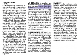||(DIRE) Roma, 4 set. – -L’autocertificazione in materia sanitaria|e’ vietata, perche’ lo stato di salute di una persona viene|osservato solo da un medico, altrimenti i medici che ce li|abbiamo a fare?-. Lo dice Antonello Giannelli, presidente|dell’Associazione Nazionale Presidi (ANP), in audizione davanti|alle Commissioni riunite Affari costituzionali e Bilancio,|parlando dell’emendamento al decreto Milleproroghe che rinvia di|un anno l’obbligo vaccinale per l’iscrizione alla scuola materna|attraverso un’autocertificazione.| (Sor/Dire)|13:42 04-09-18||NNNN|