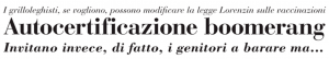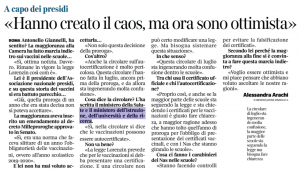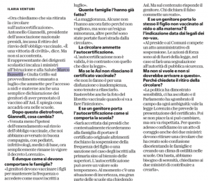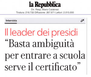 |sensibilita’ dimostrata dalle forze politiche e dal Parlamento|tutto nell’accogliere le osservazioni formulate ieri dall’Anp|durante l’audizione davanti alle Commissioni congiunte della|Camera circa la necessita’ di ritirare l’emendamento al decreto|Milleproroghe-. Lo dice all’Agi il presidente dell’Associazione|nazionale presidi, Antonello Giannelli. -A questo punto -|afferma Giannelli – chiediamo il ritiro immediato della|Circolare congiunta Istruzione e Salute|sull’autocertificazione, in quanto ha portato confusione tra le|famiglie e le scuole. Le circolari infatti – spiega il|presidente dell’Anp – non possono modificare le leggi e quindi|l’obbligo di presentazione della certificazione originale non|puo’ essere violato. Questo significa che in tutti i casi in|cui e’ stata presentata una dichiarazione sostitutiva, si deve|provvedere quanto prima a rimpiazzarla con la documentazione|dell’azienda sanitaria. Laddove funziona l’Anagrafe vaccinale|informatizzata, i dirigenti scolastici possono verificare|l’autocertificazione per via telematica, senza alcun onere|aggiuntivo per le famiglie. (AGI)|Noc|051833 SET 18||NNNN|