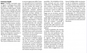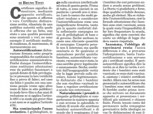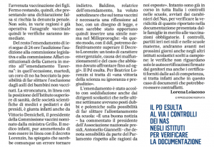 | Roma, 5 set. (AdnKronos Salute) – -Siamo pienamente soddisfatti per la|soppressione dell’emendamento. A questo punto, per evitare che si |generino ulteriori equivoci, riteniamo che sarebbe opportuno il ritiro|della circolare a firma congiunta dei ministri della salute e |dell’istruzione, che prevede l’uso dell’autocertificazione per le |vaccinazioni obbligatorie-. Così il presidente dell’Associazione |nazionale dirigenti pubblici e alte professionalità della scuola |(Anp), Antonello Giannelli, ed il presidente della Società italiana di|pediatria (Sip), Alberto Villani.|| -Condivido la viva soddisfazione per l’emendamento presentato dopo la |nostra audizione – precisa Alberto Villani – ma, come più volte |ripetuto, i certificati medici e sanitari non possono essere |sostituiti da altro documento, quindi il ritiro della circolare |metterebbe fine alla confusione generata in queste settimane-.|| (Com-Frm/AdnKronos)||ISSN 2465 – 1222|05-SET-18 19:26||NNNN|