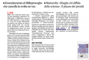 |nazionale dirigenti pubblici e alte professionalita’ della|scuola) Antonello Giannelli, ed il presidente della SIP|(societa’ italiana di pediatria) Alberto Villani, dichiarano il|loro pieno apprezzamento per la sensibilita’ dimostrata dal|Parlamento nei confronti delle richieste presentate ieri nel|corso dell’audizione nell’ambito dell’esame del Milleproroghe.|L’emendamento Baldino-Bompane, infatti, che sopprime|all’articolo 6 del decreto Milleproroghe il comma 3-octie,|recepisce le richieste piu’ volte reiterate da ANP e SIP.|-Siamo pienamente soddisfatti per la soppressione del comma|3-octie dell’articolo 6- dice Giannelli. -A questo punto, per|evitare che si generino ulteriori equivoci, riteniamo che|sarebbe opportuno il ritiro della circolare a firma congiunta|dei ministri della Salute e dell’Istruzione, che prevede l’uso|dell’autocertificazione per le vaccinazioni obbligatorie-.|-Condivido la viva soddisfazione per l’emendamento presentato|dopo la nostra audizione- precisa Alberto Villani -ma, come|piu’ volte ripetuto, i certificati medici e sanitari non|possono essere sostituiti da altro documento, quindi il ritiro|della circolare metterebbe fine alla confusione generata in|queste settimane-. | Pertanto, considerando l’inammissibilita’|dell’autocertificazione, la confusione generata dalla circolare|che si pone in contrasto con la normativa vigente e con|l’emendamento Baldino-Bompane, l’ANP e la SIP, esprimendo il|loro pieno apprezzamento per la sensibilita’ dimostrata dal|Parlamento, chiedono al ministro Bussetti ed al ministro Grillo|il ritiro della circolare. (AGI)|Noc|051854 SET 18||NNNN|