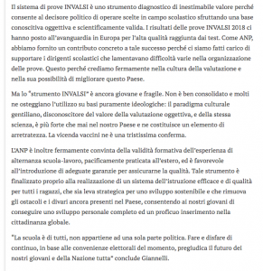 |(AGI) – Roma, 12 set. – Giannelli afferma che -il sistema di|prove INVALSI e’ uno strumento diagnostico di inestimabile|valore perche’ consente al decisore politico di operare scelte|in campo scolastico sfruttando una base conoscitiva oggettiva e|scientificamente valida. I risultati delle prove INVALSI 2018|ci hanno posto all’avanguardia in Europa per l’alta qualita’|raggiunta dai test. Come ANP – precisa – abbiamo fornito un|contributo concreto a tale successo perche’ ci siamo fatti|carico di supportare i dirigenti scolastici che lamentavano|difficolta’ varie nella organizzazione delle prove. Questo|perche’ crediamo fermamente nella cultura della valutazione e|nella sua possibilita’ di migliorare questo Paese. Ma lo|’strumento INVALSI’ e’ ancora giovane e fragile – prosegue|Giannelli – non e’ ben consolidato e molti ne osteggiano|l’utilizzo su basi puramente ideologiche: il paradigma|culturale gentiliano, disconoscitore del valore della|valutazione oggettiva, e della stessa scienza, e’ piu’ forte|che mai nel nostro Paese e ne costituisce un elemento di|arretratezza. La vicenda vaccini ne e’ una tristissima|conferma. L’ANP e’ inoltre fermamente convinta della validita’|formativa dell’esperienza di Alternanza scuola-lavoro,|pacificamente praticata all’estero, ed e’ favorevole|all’introduzione di adeguate garanzie per assicurarne la|qualita’. La scuola e’ di tutti – conclude il presidente|dell’Anp – non appartiene ad una sola parte politica. Fare e|disfare di continuo, in base alle convenienze elettorali del|momento, pregiudica il futuro dei nostri giovani e della|Nazione tutta-. (AGI)|Noc|121710 SET 18||NNNN|