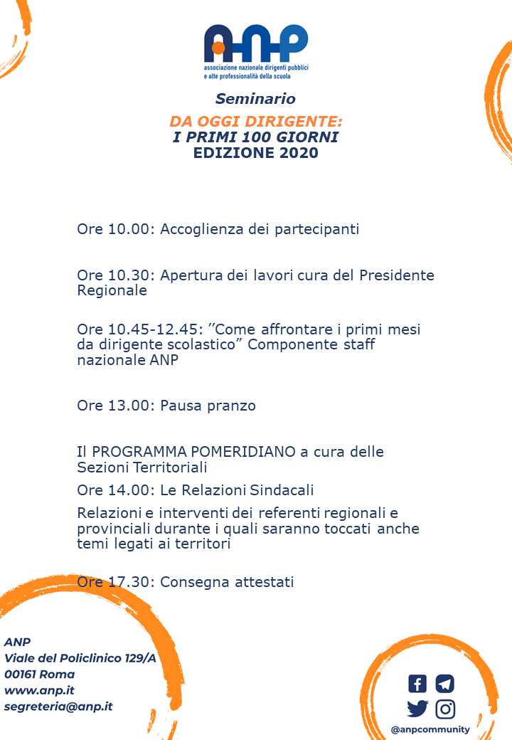• accesso all’Agenda dei 100 giorni (l’edizione 2020 sarà disponibile nella APP ANP a partire dal 27 agosto 2020) e agli altri materiali predisposti (solo per i soci ANP)