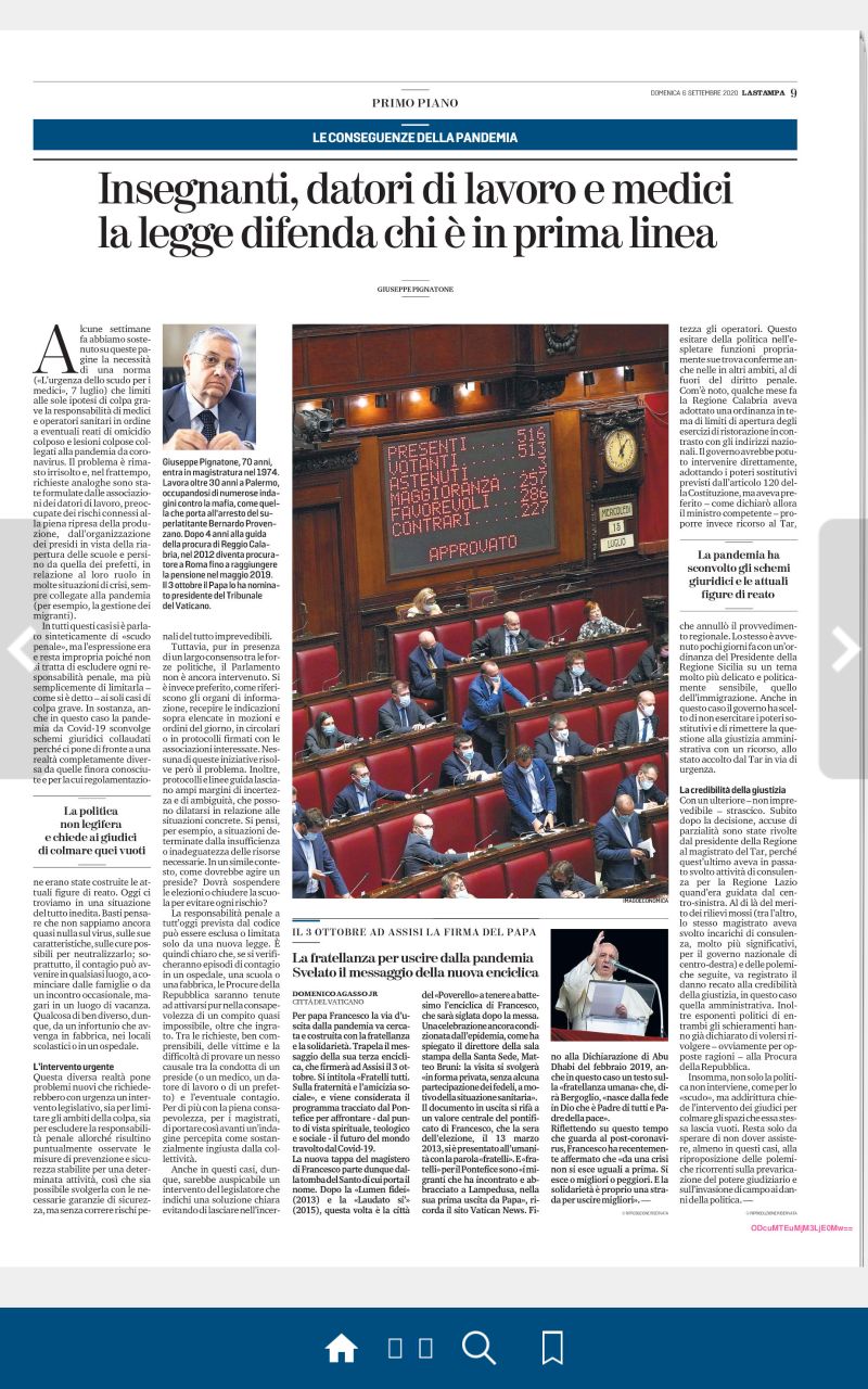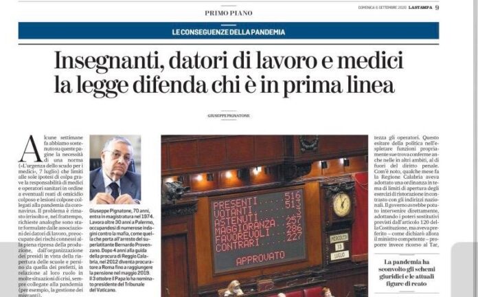 Su La Stampa di oggi 6 settembre Giuseppe Pignatone, ex Procuratore della Repubblica di Roma, interviene sul tema della revisione della responsabilità datoriale.