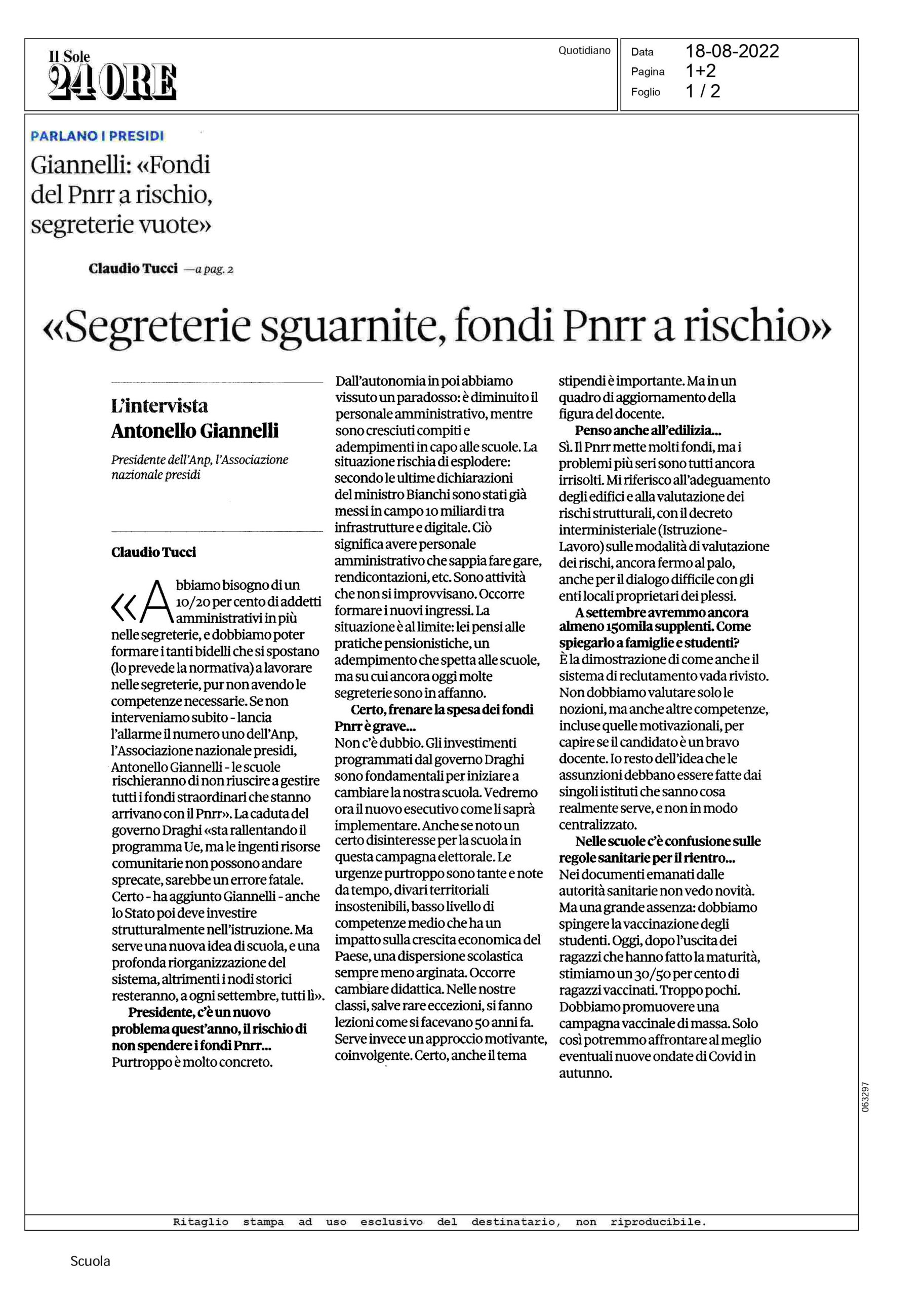 Il Presidente ANP, Antonello Giannelli, in una intervista pubblicata oggi 18 agosto 2022 sul Sole 24 Ore, in vista del rientro a scuola di settembre, fa il punto della situazione ed evidenzia i nodi da sciogliere.