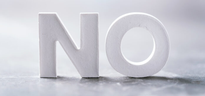 Word NO made with cement letters on grey marble background. Copy space. Business concept.