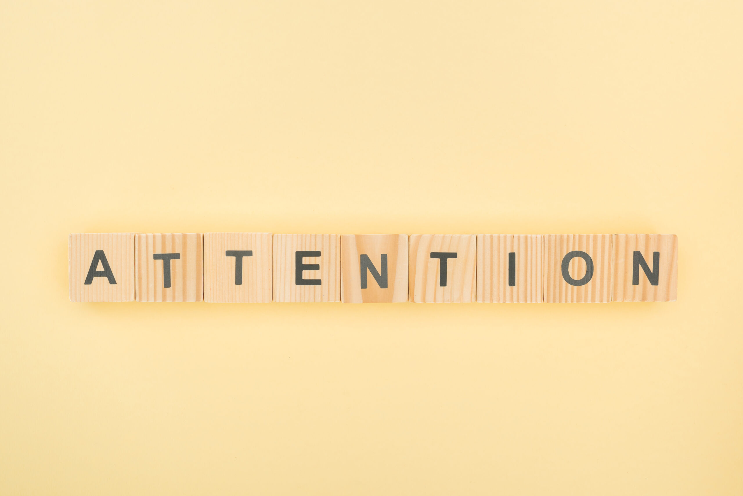 top view of attention lettering made of wooden cubes on yellow background